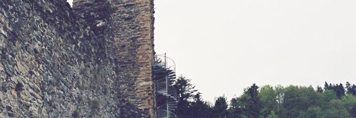 Burgruine mit Aussichtstgurm und schöner Wiese drum herum